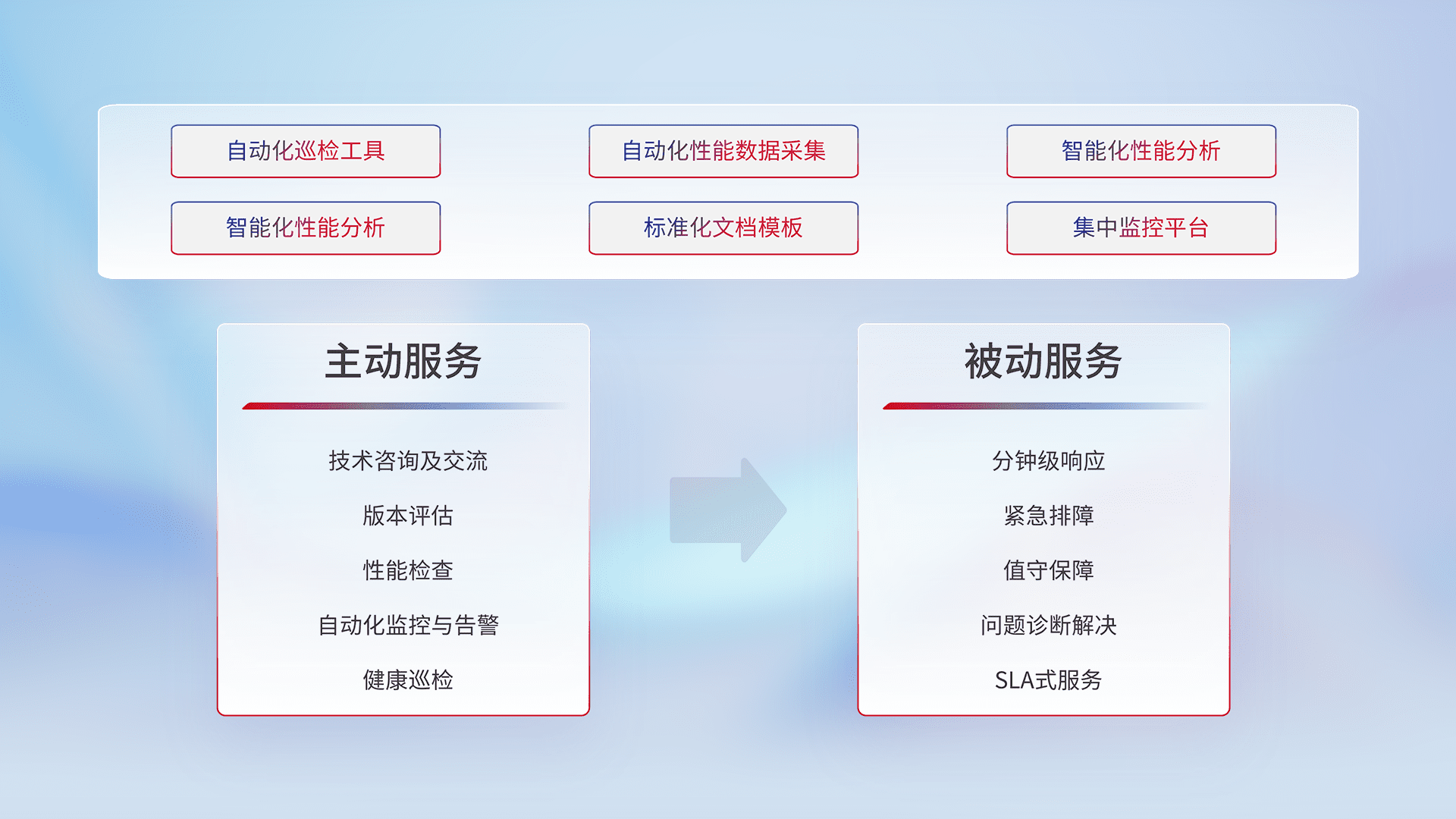 智能化工具和标准化文档,,,,保障服务质量,,,提供主动服务(包含技术咨询、、、、版本评估、、、、性能检查、、、、自动化监控与告警、、、、健康巡检)和被动服务包含(分钟级响应、、、、紧急排障、、值守保障、、、、问题诊断解决、、、、SLA服务)。。